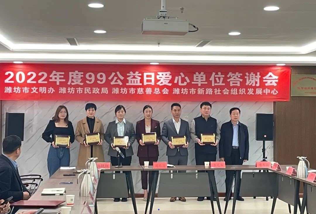2022年10月13日上午,山東省安全產(chǎn)業(yè)協(xié)會(huì)以及會(huì)長(zhǎng)單位濰坊市平安消防工程有限公司受邀參加由濰坊市文明辦、濰坊市民政局、濰坊市慈善總會(huì)、濰坊市新路社會(huì)組織發(fā)展中心舉辦的2022年度99公益日愛(ài)心單位答謝會(huì)活動(dòng)。出席本次答謝會(huì)領(lǐng)導(dǎo)有: 濰坊市委宣傳部二級(jí)調(diào)研員 劉西海 市民政局二級(jí)調(diào)研員 李凡華 市慈善總會(huì)專(zhuān)職副會(huì)長(zhǎng) 孫艷紅 濰坊市社會(huì)組織培育中心黨委書(shū)記 曹冬梅 以及公益團(tuán)體、商業(yè)協(xié)會(huì)、愛(ài)心單位等相關(guān)負(fù)責(zé)人共28人參加。此次答謝會(huì)由濰坊市社會(huì)組織培育中心黨委書(shū)記曹冬梅主持。